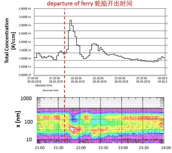 大大的方便了研究人員的監測過程,從輪船開出的時間開始監測,輔以數據展示了U-SMPS掃描電遷移率粒徑譜儀在顆粒物總濃度奈米顆粒物監測方面的突出優勢。
