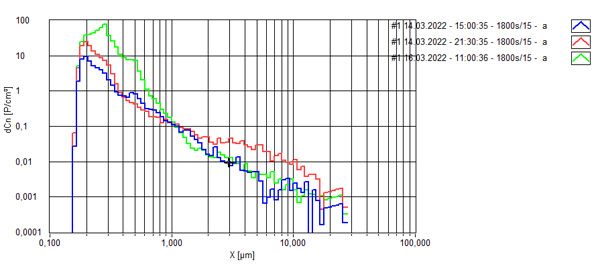 由於降雨,大部分撒哈拉沙塵被沖刷為降水,而造成红色雨水的原因是由於顆粒中的高氧化鐵含量造成了如圖1所示的微红色顆粒。測量到的粒徑大小在 1-10 µm 範圍內,由於粗粒徑顆粒在氣溶膠狀態下的停留時間並不長,所以就需要有精準的儀器來進行測量。Palas®在德國卡爾斯鲁厄通過 AQ Guard 空氣質量監測儀測量的粒徑尺寸分布。